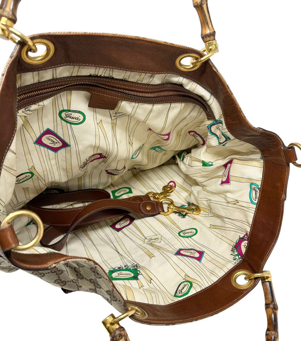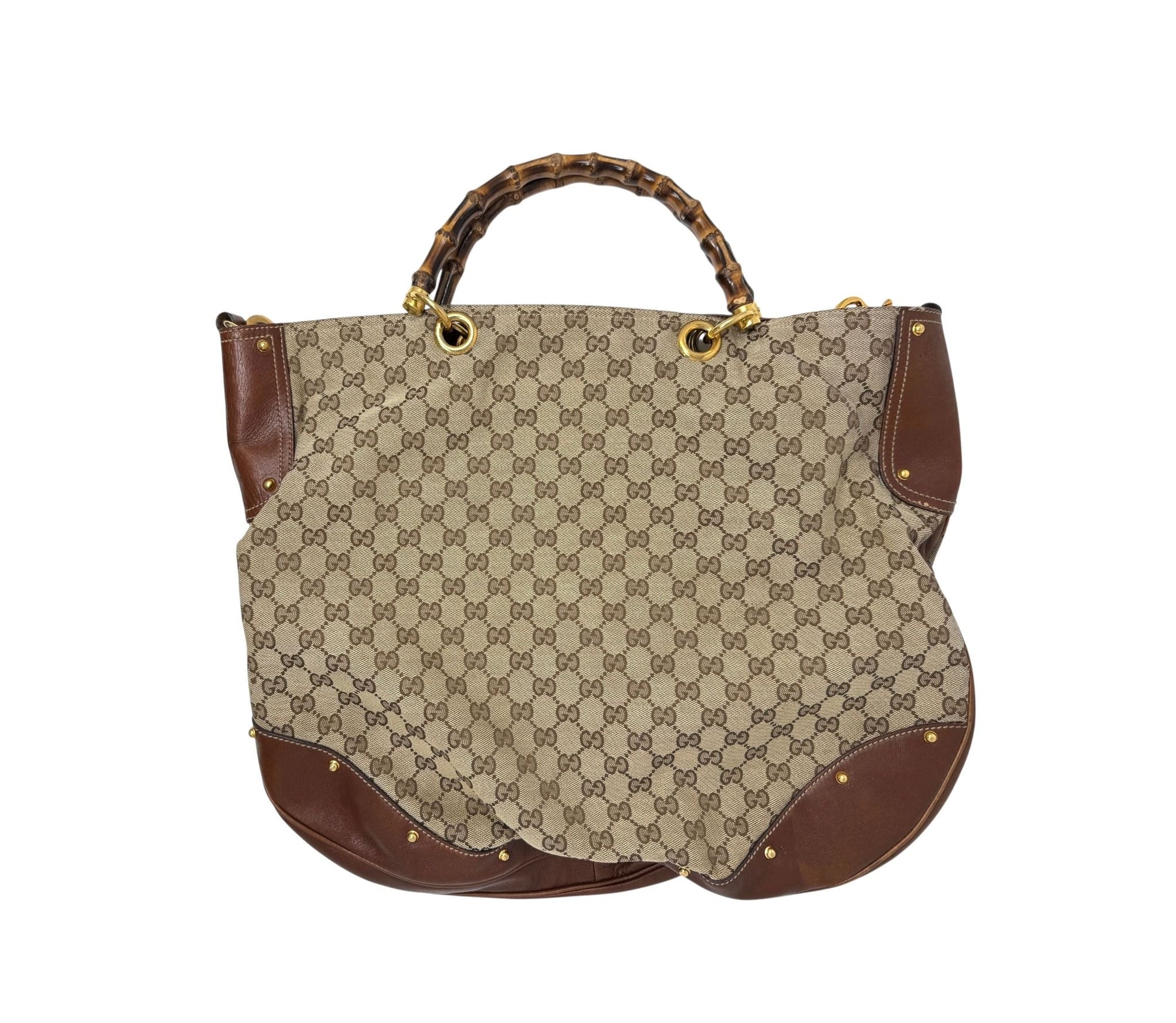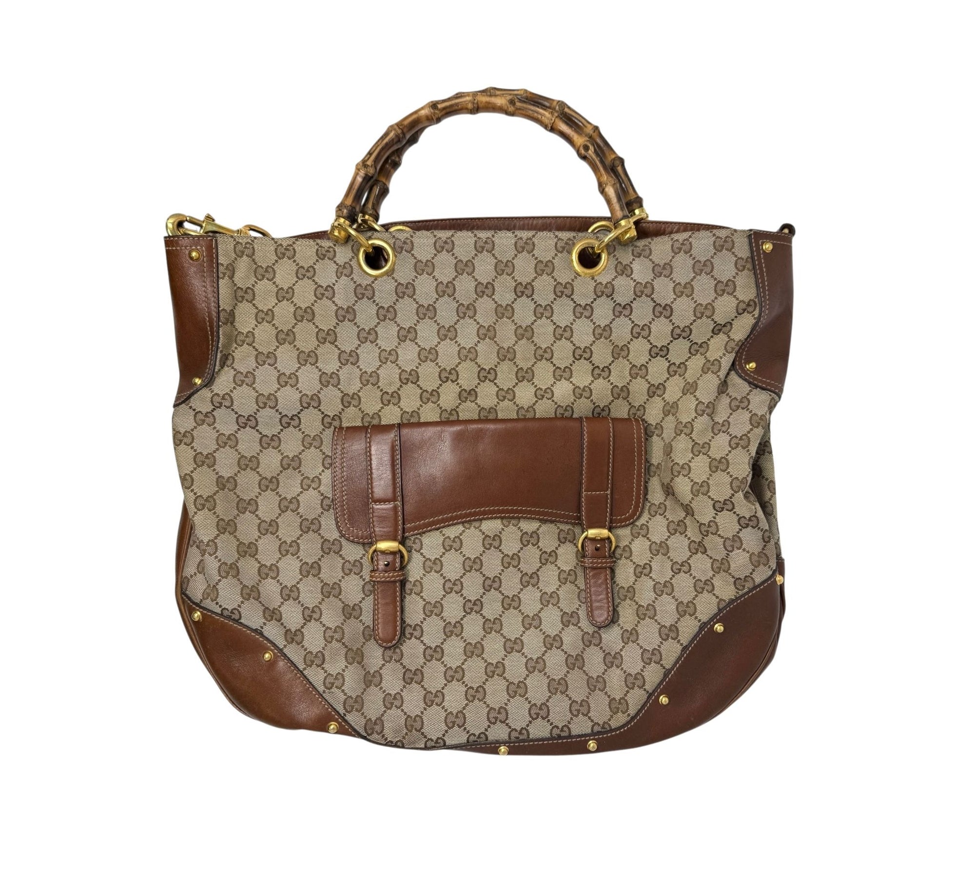 Gucci Large Brown Canvas + Leather Bamboo Tote Bag